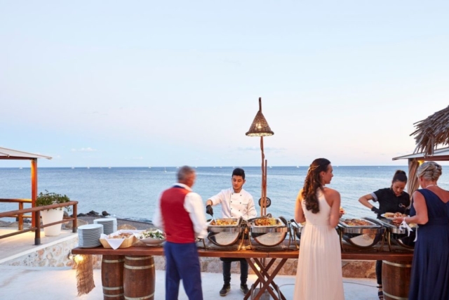 The ceremony and wedding Banquet can be held both on the outdoor terrace “Theros Wave Bar”, where you can freely accommodate up to 200 guests, and directly on the beach. The site is located in a rather secluded place, and it is ideal for an extravagant party, and for a romantic celebration