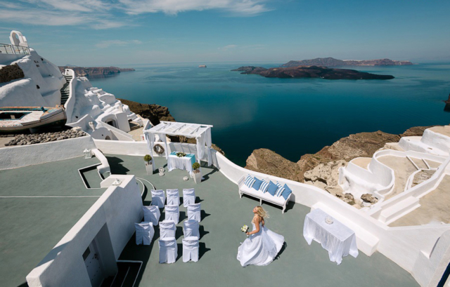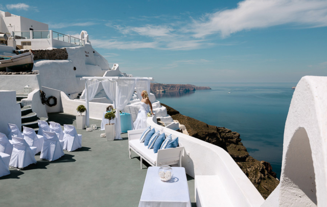 The beautiful Santa Irini Wedding venue at Fira Santorini by the Caldera side offers uninterrupted panoramic sea views with the Volcano of Santorini in the background.