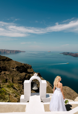Santa Irini Chapel is one of the most spectacular locations to have your wedding in Santorini and probably the Greek islands. The wedding ceremony takes place on the terrace high above the Caldera cliffs of Santorini, overlooking the volcano and the deep blue Aegean Sea.